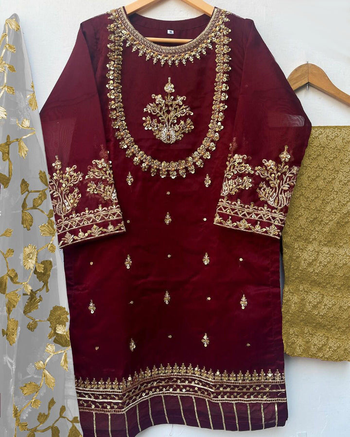 Grace meets elegance in our Handworked Embroidered 3PC Organza Suit, crafted to make you shine at every celebration 🌺✨. This masterpiece features delicate embroidery and handwork on the neck, sleeves, and daman, paired with a beautifully embroidered organza dupatta that completes your graceful look.